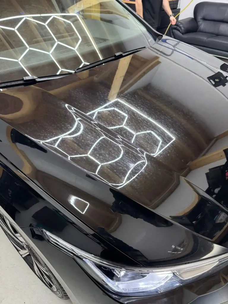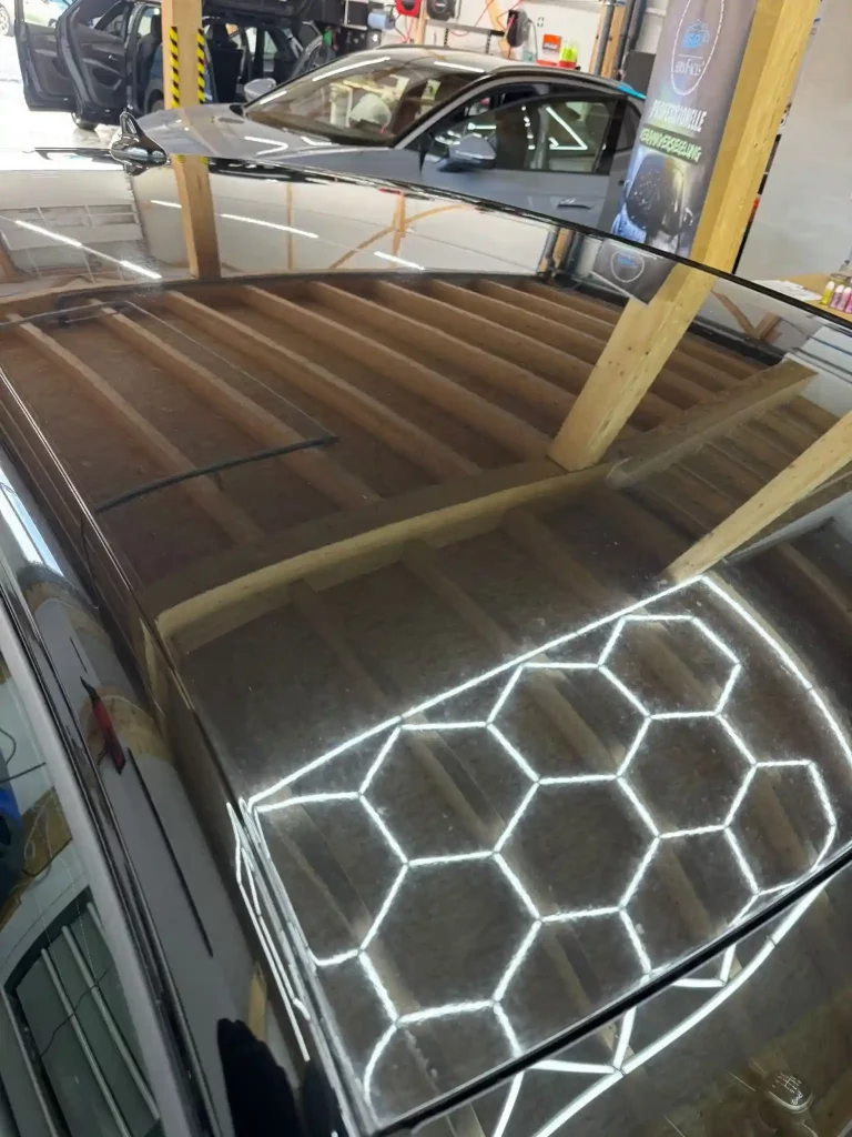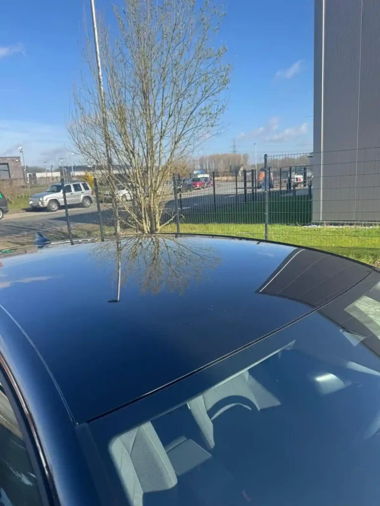 Der größte Aufwand lag bei der Aufbereitung des Lackes. Auf mehreren Stellen waren Vogelkotflecken bereits in den Lack eingebrannt, was bei vielen Fahrzeugen ein häufiges Problem ist. Diese Rückstände greifen den Lack an und hinterlassen matte oder beschädigte Stellen.